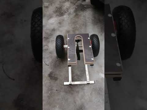 Разборная тележка для лодочного мотора изготовлена из полированного нержавеющего профиля 25 х 25 мм, ламинированной фанеры толщиной 15 мм.